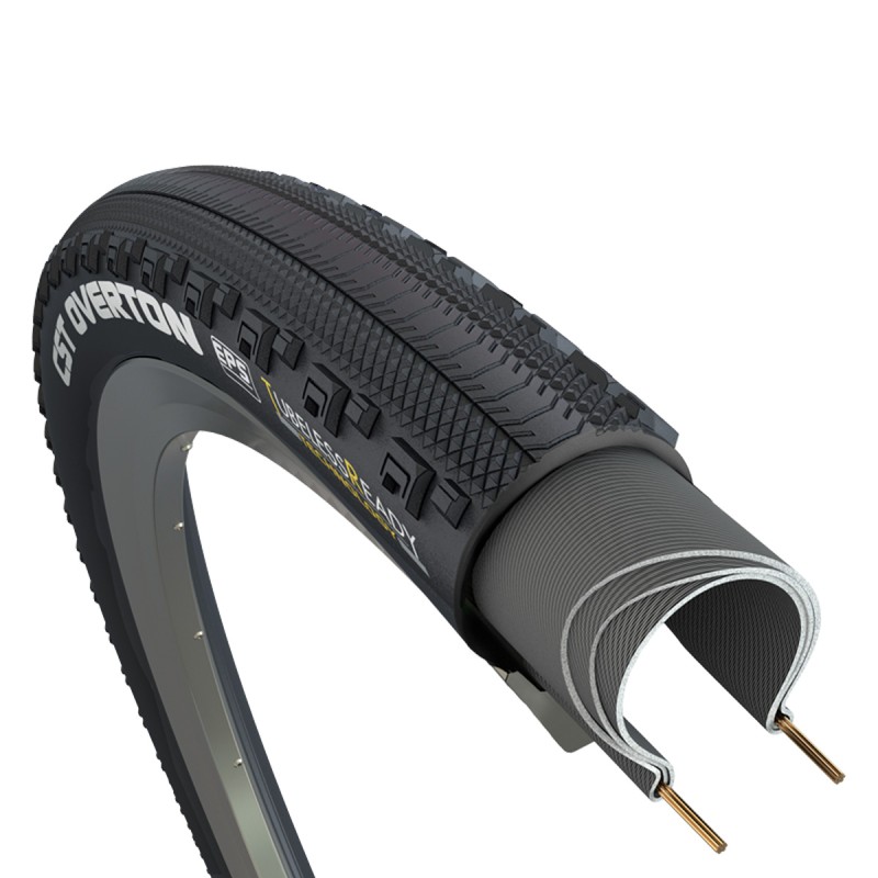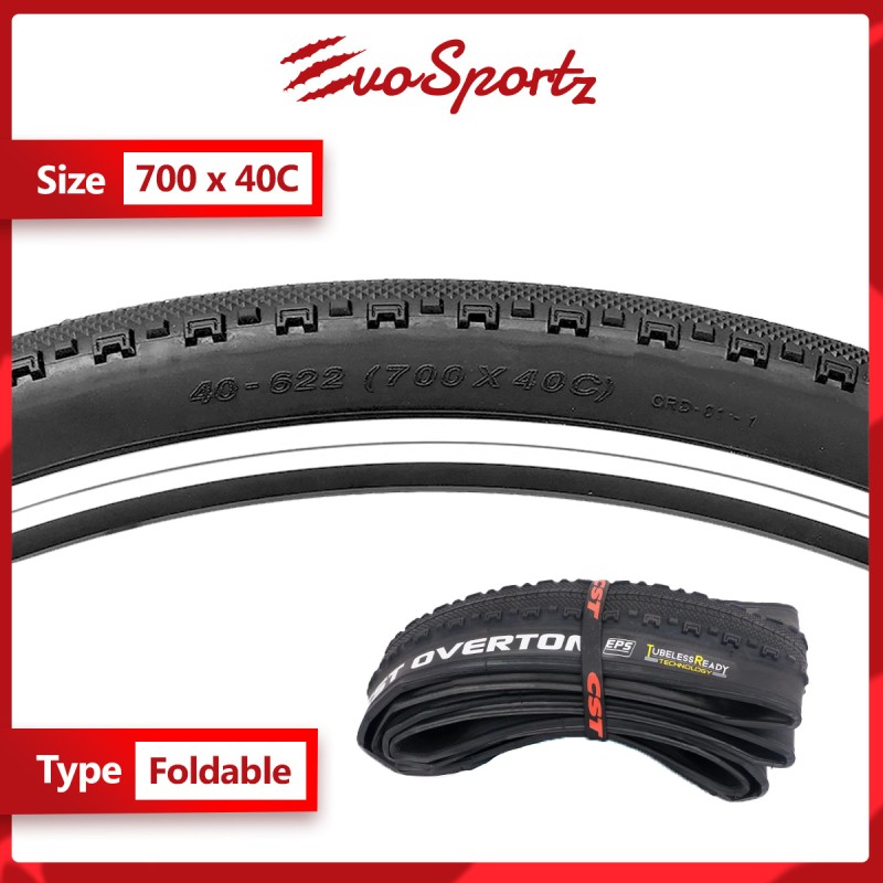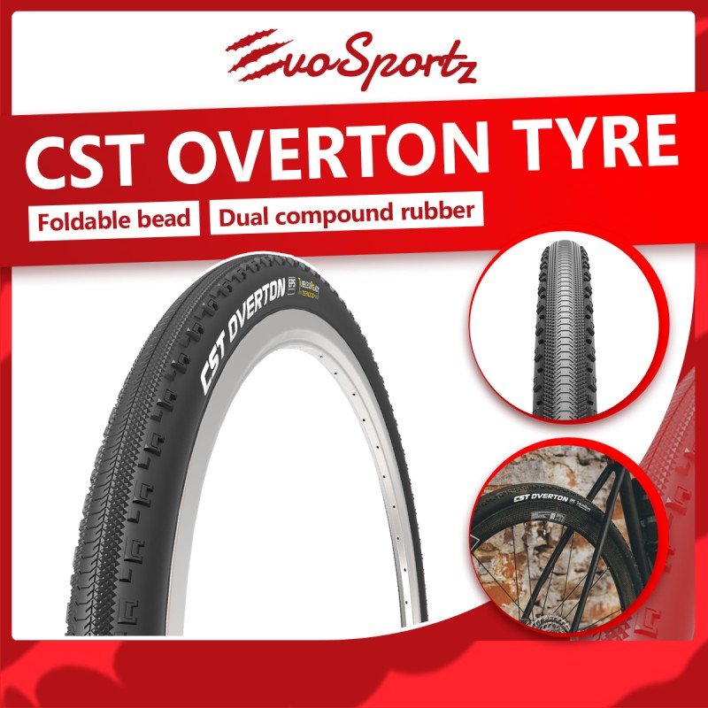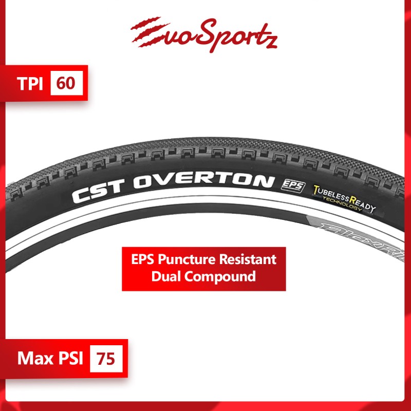 Enjoy an additional 5% off retail price when you walk-in to our store to purchase as a member.The CST Overton Tyre is a fast rolling gravel tire that features a smooth center section with knurling at the mid-point of the tire. The pronounced side knobs of the Overton let you lean your bike through the tightest turns with ease. The Overton also features a tubeless ready casing and EPS puncture protection.