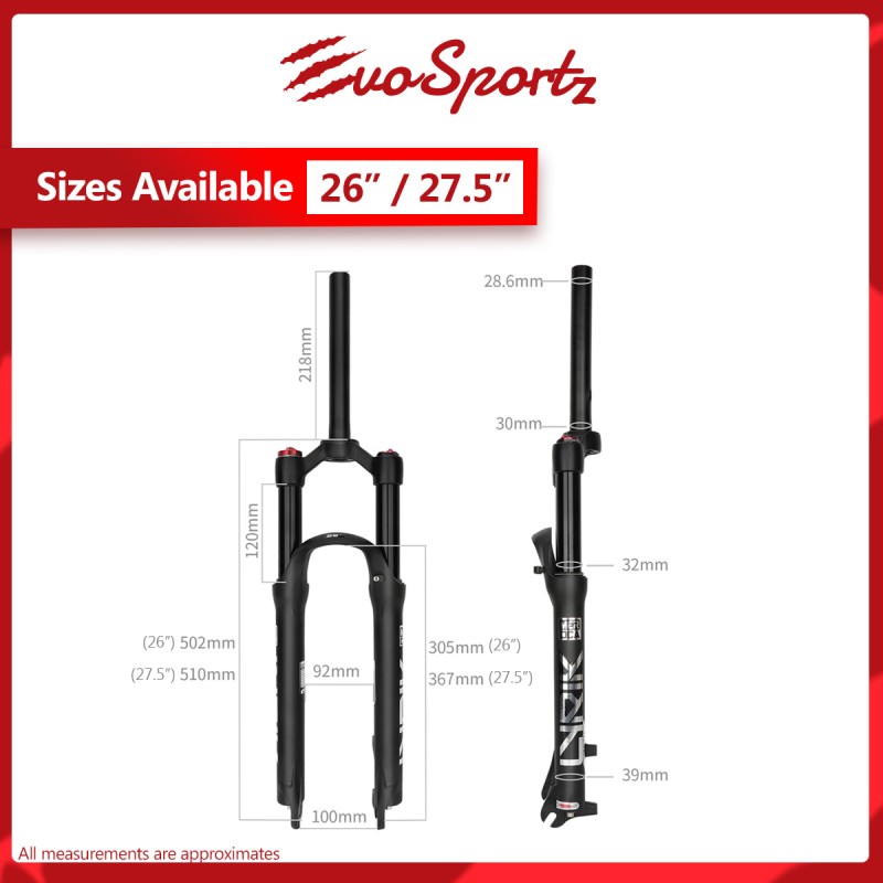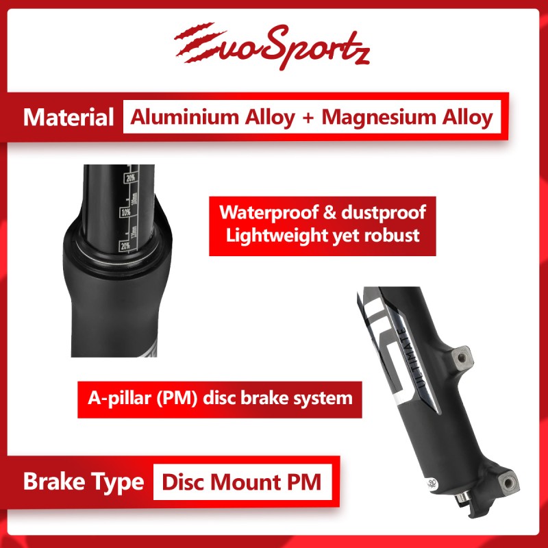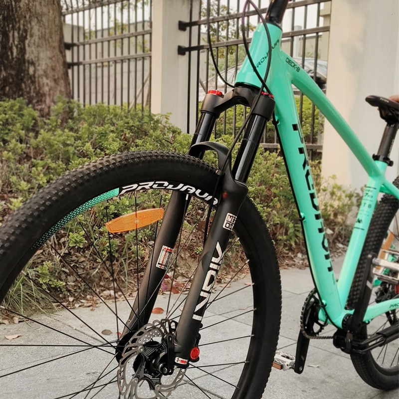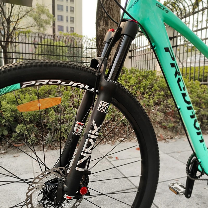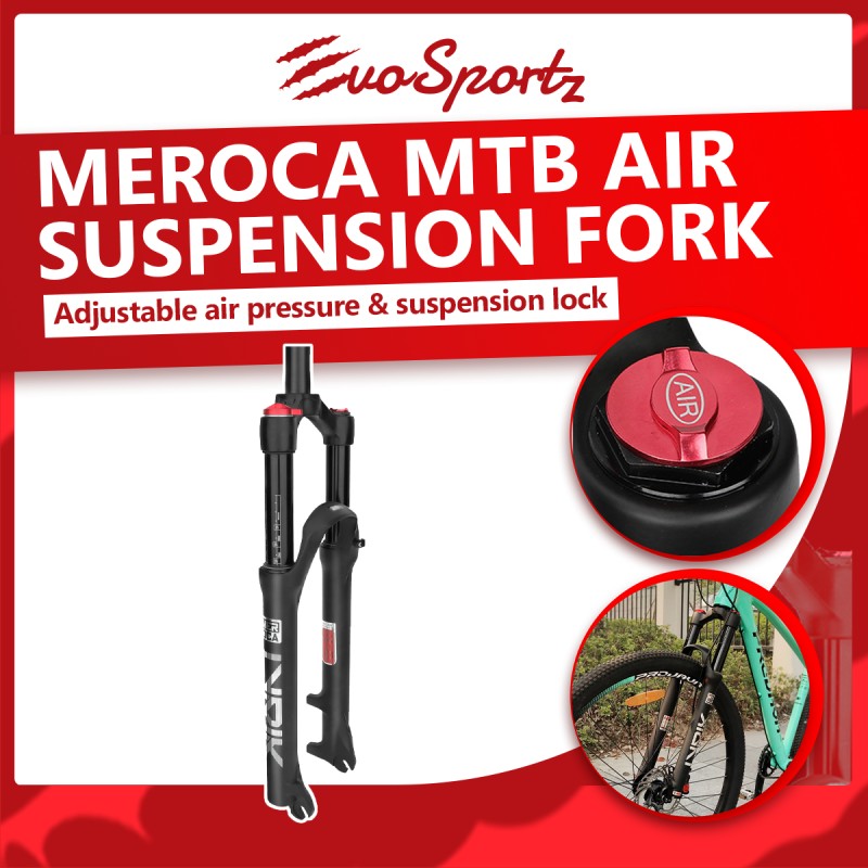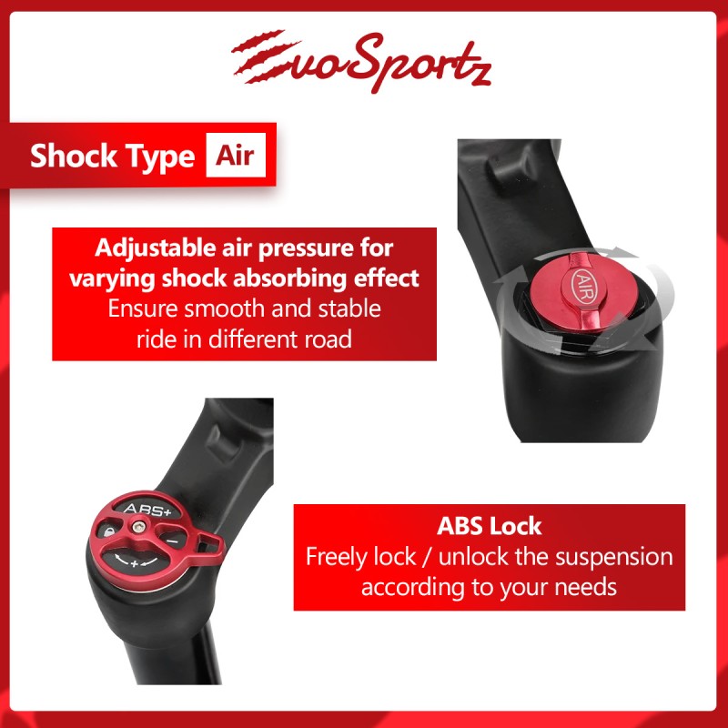 The Meroca MTB Air Suspension Fork dampens vibrations on uneven terrain and roads to give you a smooth and comfortable ride. You can adjust the air pressure for different degrees of damping, and the ABS lock allows you to toggle the suspension freely.