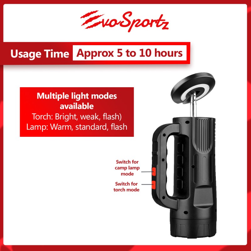 Modes: Torch (Bright, weak, flash) / Camping Lamp (Warm, standard, flash)