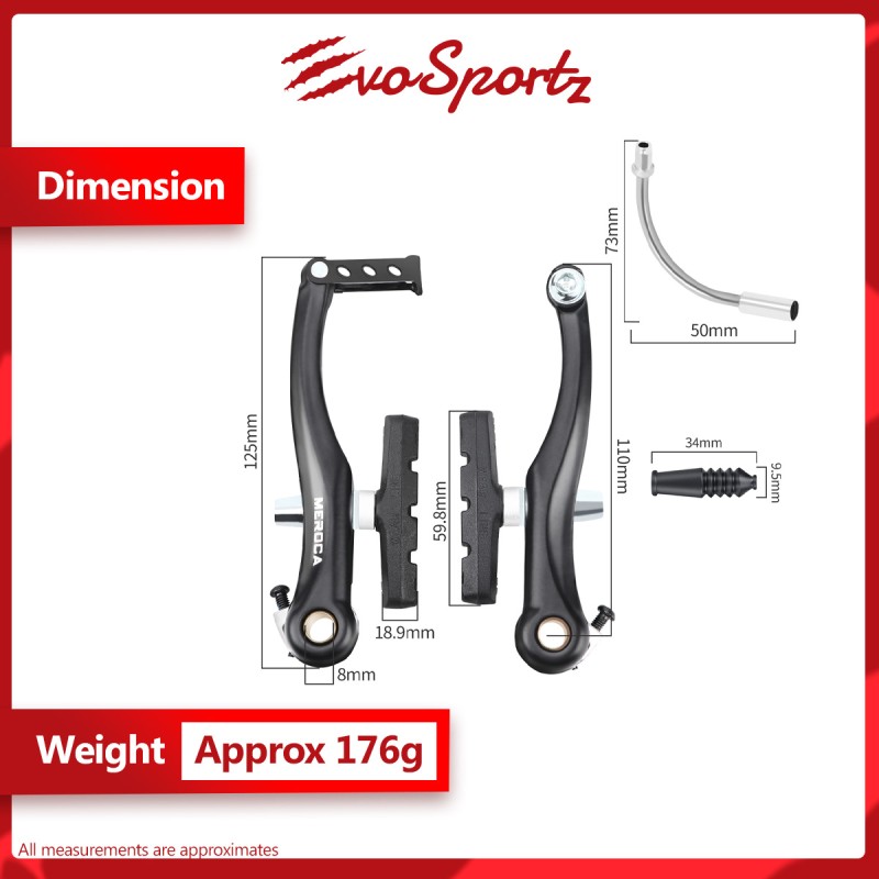 Aluminium made, durable quality. The Meroca 110mm V Brake is the perfect fit for most folding bikes and bicycles that uses a V brake. Use this V brake for either the front or rear brake. Each pack comes with one V brake and its noodle and dust cover.