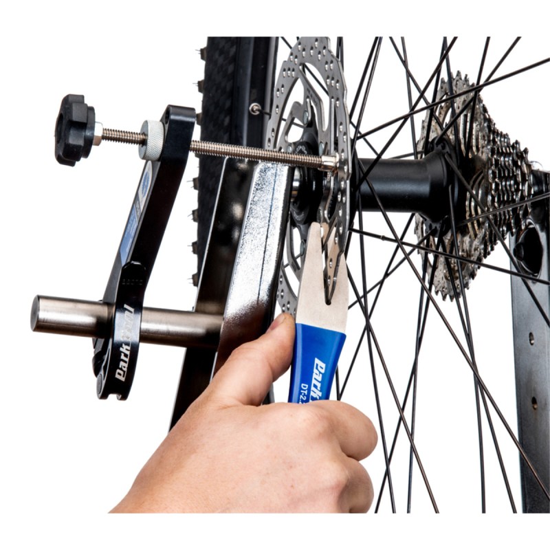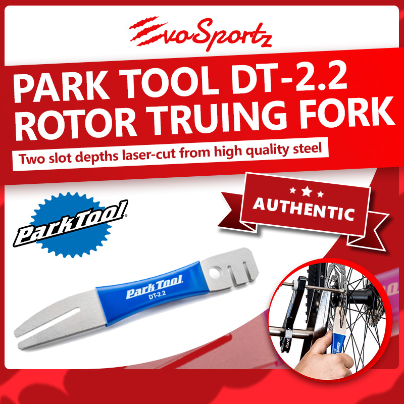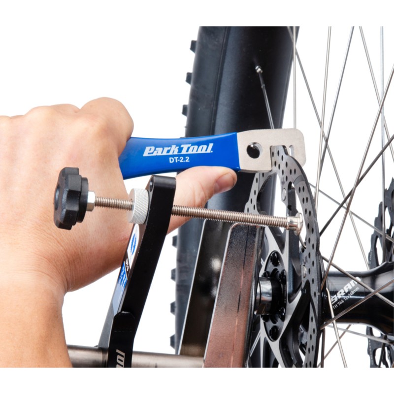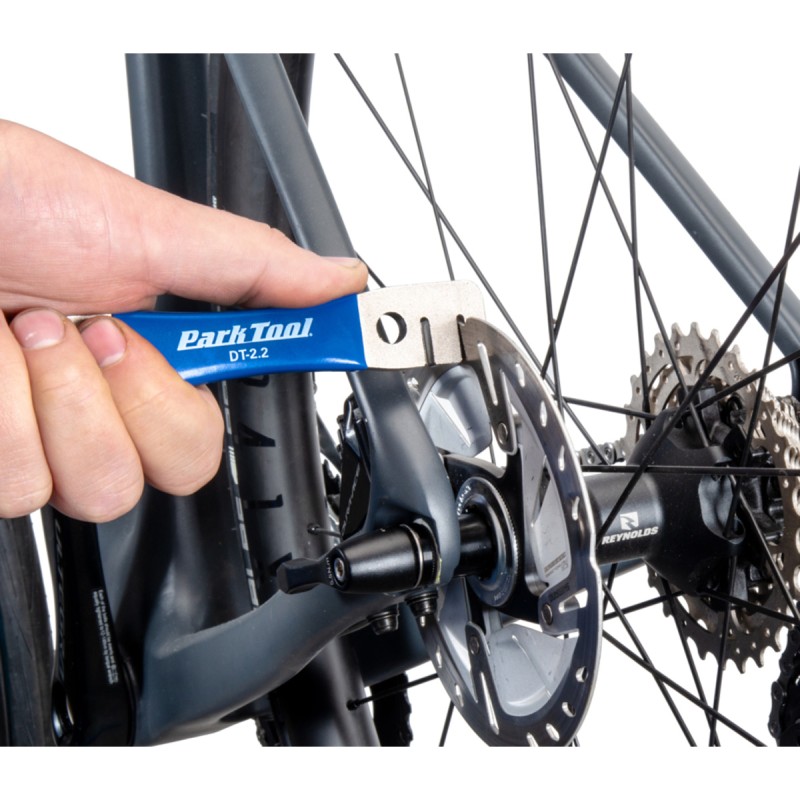 Bicycle disc brake rotors can become warped from extensive use, excessive heat, or impact. Even new disc rotors may not always be perfectly straight, causing annoying pad rub and affecting performance. The Park Tool DT-2.2 is specially designed and precisely manufactured to gently adjust bent bicycle disc brake rotors. The DT-2.2 features one long slot and two short slots for maximum compatibility with any rotor design or thickness up to 2.5 mm. Constructed from high quality steel with a vinyl dipped handle for comfort.