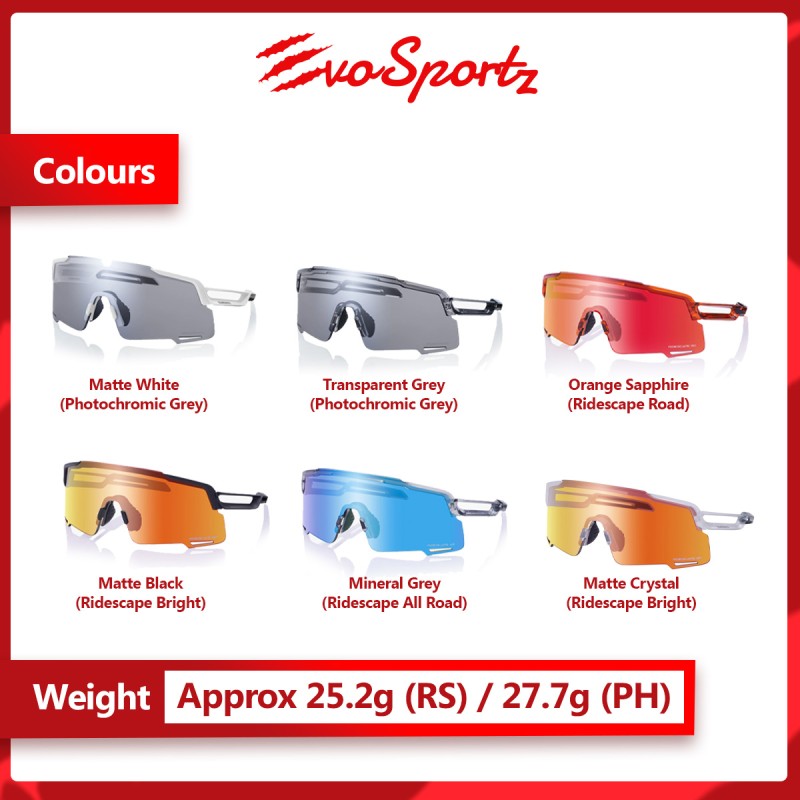 Colours Available: Mineral Grey (Ridescape All Road) / Matte Black (Ridescape Bright) / Matte Crystal (Ridescape Bright) / Transparent Grey (Photochromic Grey) / Matte White (Photochromic Grey) / Orange Sapphire (Ridescape Road)